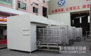 (8)烘干箱內(nèi)可存放1輛推車。推車配置耐高溫角輪(定向輪、萬向輪各2個),推車?yán)锩姘惭b限位柱用于定位里面托盤,兩側(cè)配有L形托架,用于支撐及左右限位托盤。進(jìn)出口裝有手動爐門。頂部部置循環(huán)風(fēng)機、蒸氣換熱器等裝置,排廢風(fēng)機安裝在爐體頂部。